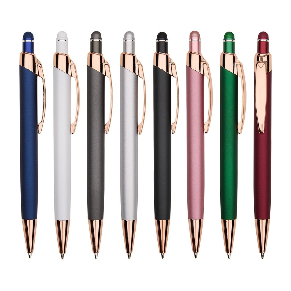 Descrição: Caneta metálica com carga esferográfica azul de 1,0mm e acionamento por clique de revestimento emborrachado para interação em dispositivos com telas sensíveis ao toque.