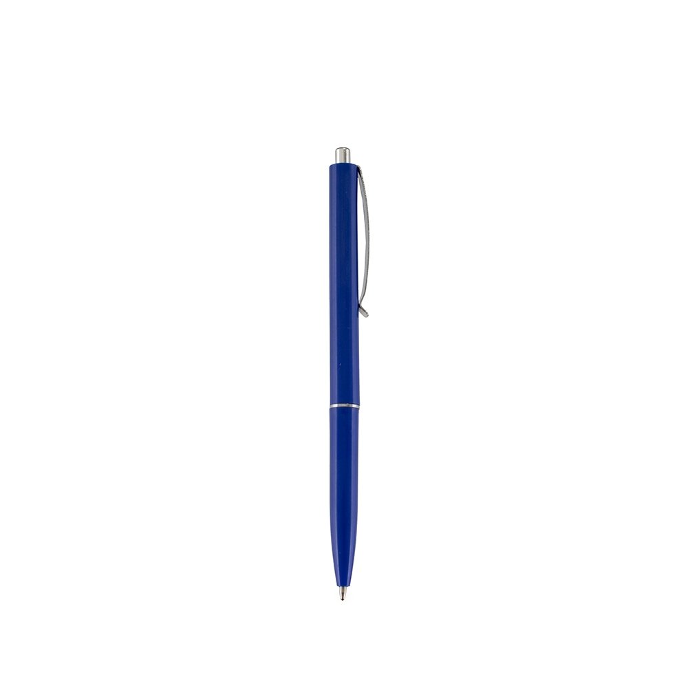 Descrição: Caneta plástica com clip e ponteira em metal. Possui acionamento por clique e carga esferográfica azul de 1.0mm.