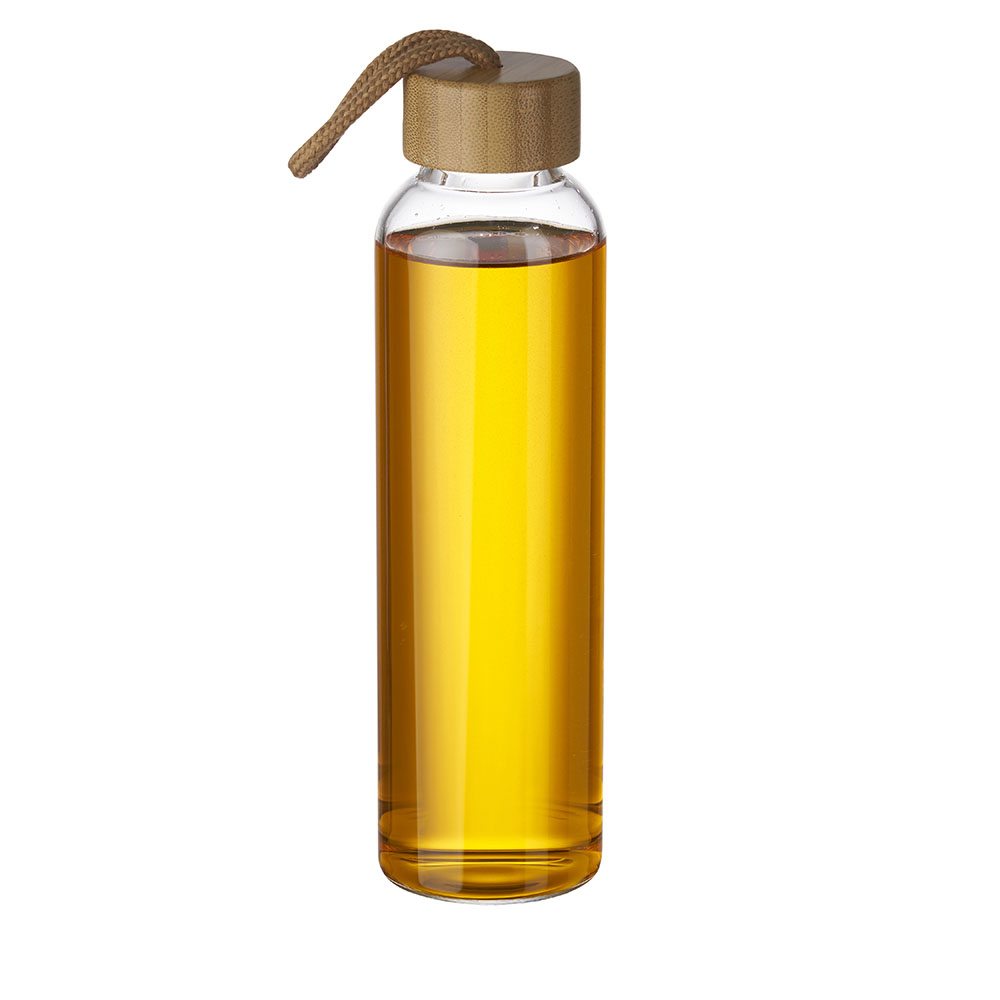 Garrafa de vidro 600 ml, tampa de bambu com alça de tecido.
