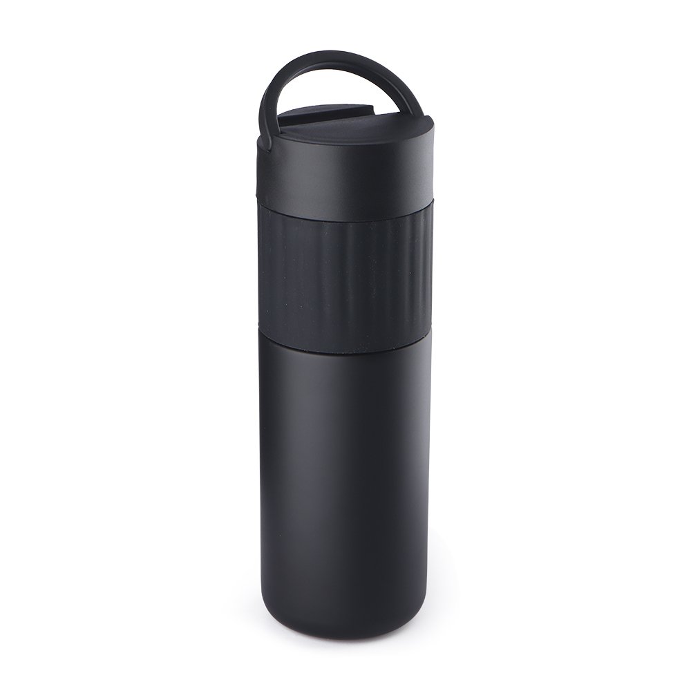 Garrafa térmica em aço inox com parede dupla isolada a vácuo, com capacidade de até 500ml. Conserva a temperatura quente ou fria, com alça e suporte para celular na tampa. Apoio para mão emborrachado e tampa rosqueável com anel de silicone para vedação.