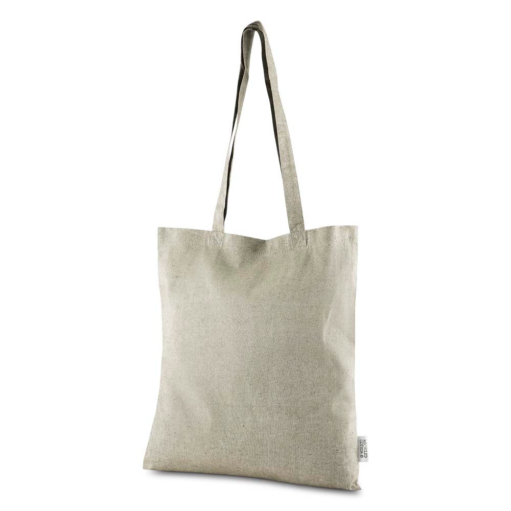 Sacola confeccionada em algodão mescla reciclado, gramatura 140 g/m². Possui alça de 65 cm ponta a ponta.