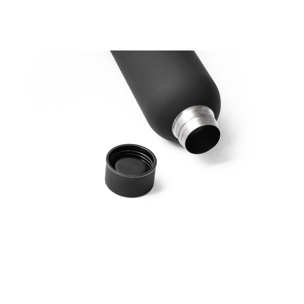 Squeeze em aço inox com acabamento em borracha, parede dupla isolada a vácuo e capacidade até 550 mL (térmico). Preserva as bebidas quentes por 8 horas e as bebidas frias por 24 horas. Food grade. Fornecido em caixa de oferta. ø70 x 220 mm