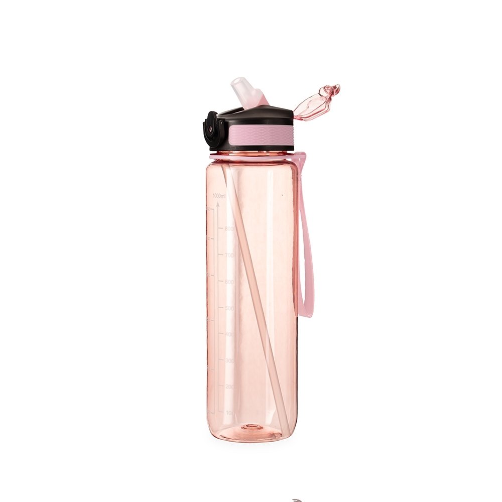 Descrição: Squeeze plástico livre de BPA com capacidade máxima de 1,05L e marcação de volume de até 1L. Possui tampa rosqueável com bico flip, tampa protetora, botão de acionamento com trava de segurança. Acompanha canudo interno em plástico e alça para transporte em nylon.